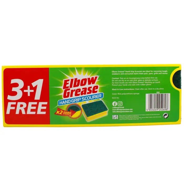 151 Elbow Grease Heavy Duty Hand Grip Scourer is designed to tackle the toughest kitchen messes with ease. Its double-strength scourer quickly removes stubborn stains and burnt-on food from a variety of kitchen surfaces, making everyday cleaning faster and more efficient. The heavy-duty construction delivers powerful scrubbing action, ideal for oven racks, pots, pans, and any cookware that requires deep, thorough cleaning without compromising performance. Featuring a comfortable hand grip, this scourer ensures better control and precision during intense cleaning tasks, reducing strain on your hands while allowing you to apply the necessary pressure for stubborn residues. The long-lasting pad material retains its strength through repeated household use, ensuring reliability and durability over time. Its high-quality sponge component offers excellent absorption, making cleaning more effective and efficient with every wipe. Versatile and practical, the 151 Elbow Grease Heavy Duty Hand Grip Scourer is suitable for sinks, stovetops, and a wide range of kitchen surfaces, making it an indispensable tool for maintaining a spotless home.