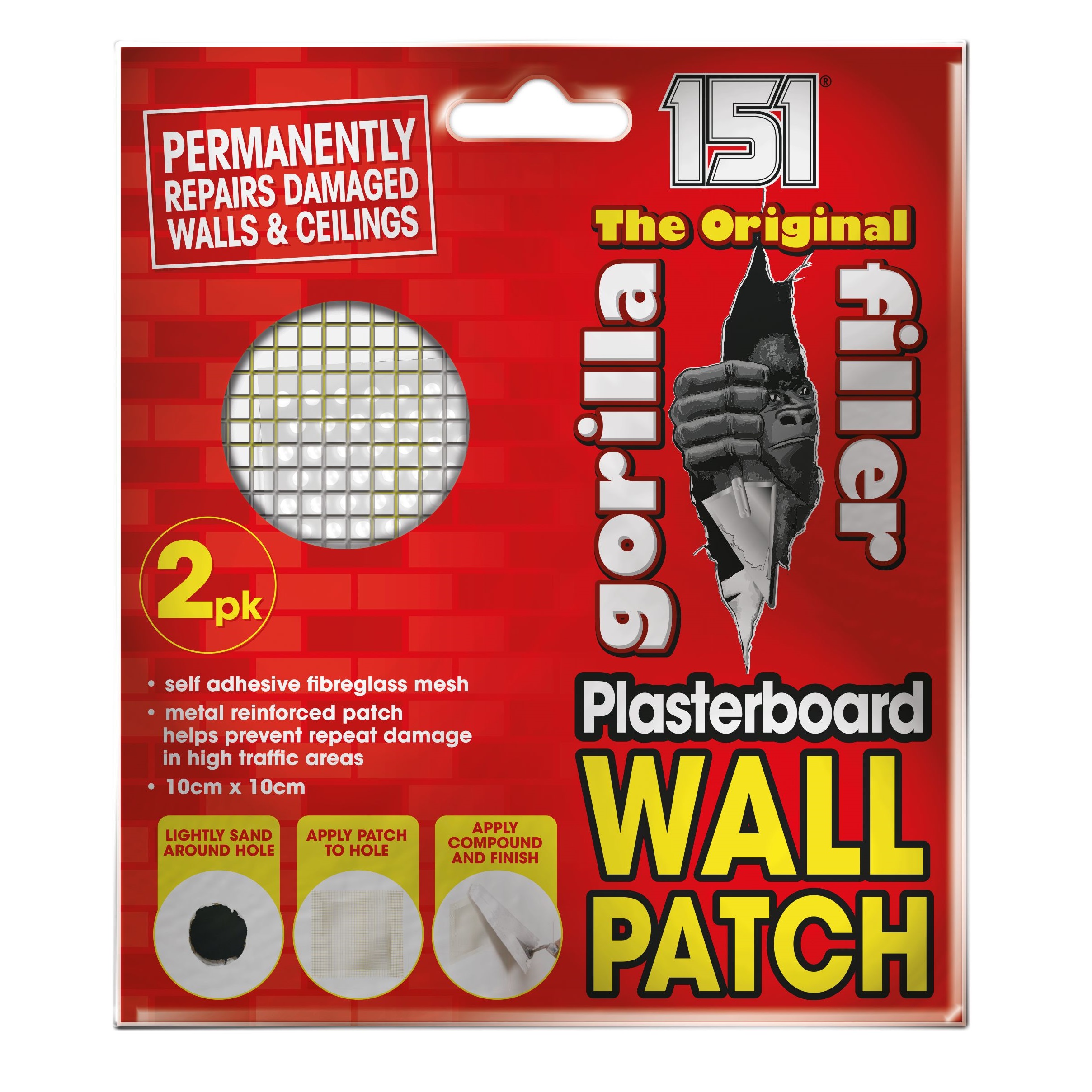 The 151 Gorilla Filler Plasterboard Wall Patch is the ultimate solution for permanently repairing damaged walls and ceilings. Designed for quick and effortless application, this self-adhesive fibreglass mesh patch is reinforced with metal to provide a durable and long-lasting repair. Whether you are dealing with cracks, holes, dents, or scuffs, this wall patch ensures a smooth and seamless finish, eliminating the need for extensive plastering work. Each pack contains two 10cm x 10cm patches, making it ideal for fixing multiple areas or keeping a spare for future repairs. The metal reinforcement provides additional strength, preventing repeat damage, especially in high-traffic areas where walls are more susceptible to impact. From home renovations to quick touch-ups, this patch is a versatile and essential tool for DIY enthusiasts and professionals alike. Applying the 151 Gorilla Filler Plasterboard Wall Patch is incredibly simple. Start by lightly sanding around the damaged area to ensure proper adhesion. Then, place the self-adhesive patch over the hole or crack, pressing it firmly into place. Once secured, apply a plaster compound over the patch and smooth it out to blend seamlessly with the surrounding surface. Once dry, the area can be sanded, painted, or wallpapered, restoring your wall to its original appearance. This wall patch serves as an efficient alternative to traditional plastering, allowing users to complete repairs quickly without needing extensive experience or professional assistance. It works on plasterboard, drywall, and ceilings, making it a versatile and cost-effective solution for home repairs. Whether fixing accidental damage from furniture, covering up holes left by old fittings, or reinforcing vulnerable wall areas, this patch provides reliable protection and long-term durability. The self-adhesive backing eliminates the need for additional adhesives, ensuring a secure and hassle-free installation process. The fibreglass mesh provides excellent adhesion and flexibility, while the metal reinforcement adds structural integrity to prevent further cracking or breaking. Designed for both residential and commercial use, this repair patch helps maintain a flawless and professional look on any wall or ceiling. Perfect for homeowners, decorators, and contractors, the 151 Gorilla Filler Plasterboard Wall Patch is a must-have repair solution that saves time, effort, and money. Whether dealing with wear and tear, accidental damage, or renovation projects, this strong and durable patch ensures walls remain intact and visually appealing.