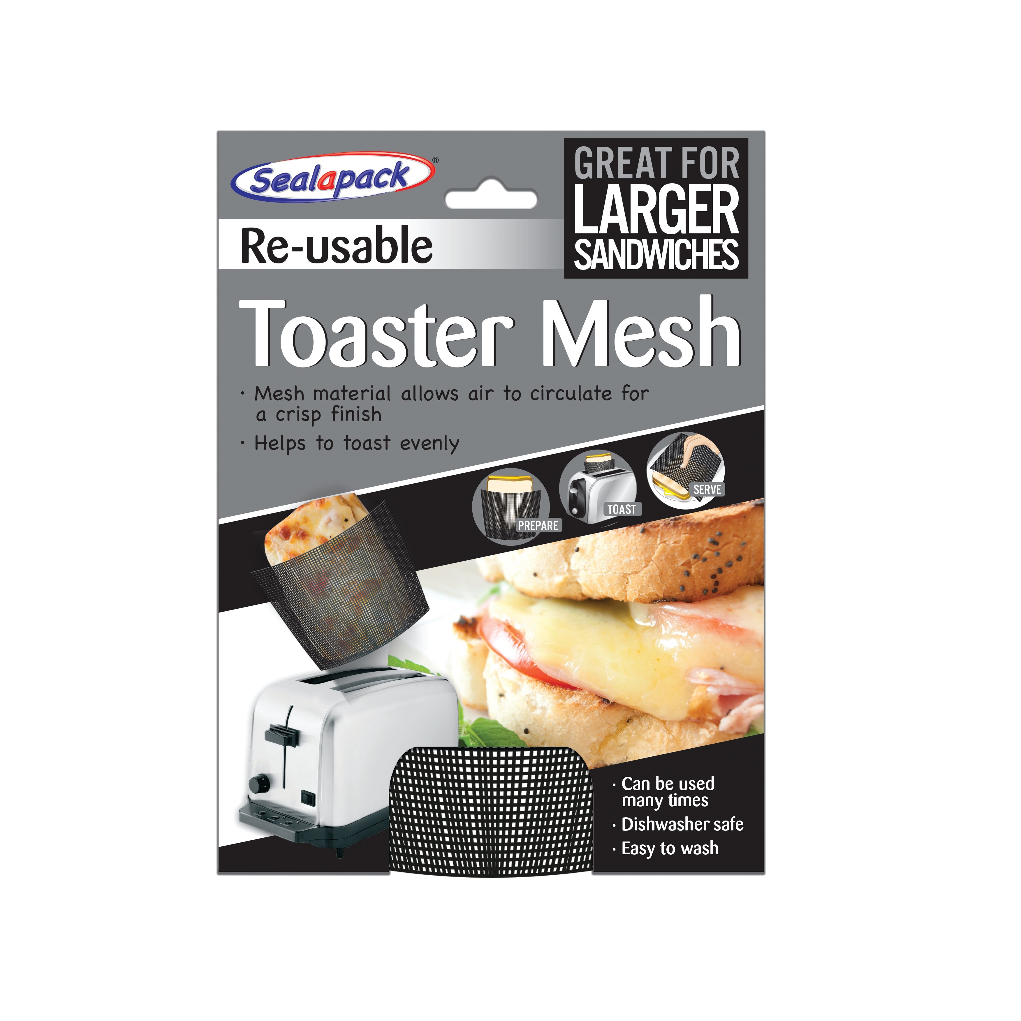 The Sealapack Re-Usable Toaster Mesh Bag is an innovative and practical kitchen accessory that ensures perfect, evenly toasted sandwiches every time. This unique toaster mesh is designed to toast bread, sandwiches, and other snacks with ease, making it an ideal solution for both home kitchens and sandwich enthusiasts. With its re-usable nature, this toaster mesh bag offers an eco-friendly, cost-effective alternative to traditional single-use toaster bags or foil. Whether you are toasting sandwiches for breakfast, lunch, or a quick snack, this product guarantees consistently excellent results. One of the standout features of the Sealapack Re-Usable Toaster Mesh is its mesh material. The fine mesh allows hot air to circulate around the sandwich or bread, promoting even toasting and helping to achieve a golden, crispy finish on all sides. Unlike other toaster methods, where parts of your sandwich may be undercooked or overly toasted, the mesh bag ensures that every part of the bread is evenly heated for a deliciously crisp texture. This feature is especially useful for larger sandwiches, as the mesh bag helps the heat distribute uniformly, ensuring a perfectly toasted result no matter the sandwich size. The Sealapack Toaster Mesh is especially great for larger sandwiches, which may not fit into standard toaster slots. This mesh bag accommodates larger portions, allowing you to toast hearty sandwiches, including those filled with thick slices of bread and plenty of toppings, without worrying about them getting stuck or unevenly cooked. Its spacious design makes it a versatile tool that will appeal to anyone who enjoys making larger or more elaborate sandwiches. Another key benefit of the Sealapack Re-Usable Toaster Mesh is that it is dishwasher-safe. Cleaning up after toasting your sandwiches is simple and convenient. After use, just pop the mesh bag in the dishwasher, or wash it by hand if you prefer, and it will be ready for your next toasting session. This feature makes the toaster mesh easy to maintain and ensures hygiene with minimal effort, allowing you to enjoy the benefits of this kitchen tool without worrying about tedious cleaning. Beyond sandwiches, this mesh bag can be used for a variety of other foods, such as slices of bread, bagels, and even frozen snacks, making it a versatile addition to your kitchen arsenal. Whether you are toasting a quick snack or preparing a large meal, the Sealapack Re-Usable Toaster Mesh makes sure your food is cooked evenly with a crisp, golden finish. The Sealapack Re-Usable Toaster Mesh Bag is a fantastic kitchen accessory for anyone who loves to toast their bread and sandwiches to perfection. Its re-usable design, even toasting capability, and easy cleaning features make it a must-have for those who appreciate both convenience and quality. Whether you are toasting a simple sandwich or a large, complex creation, this toaster mesh bag helps achieve consistently great results with minimal effort.