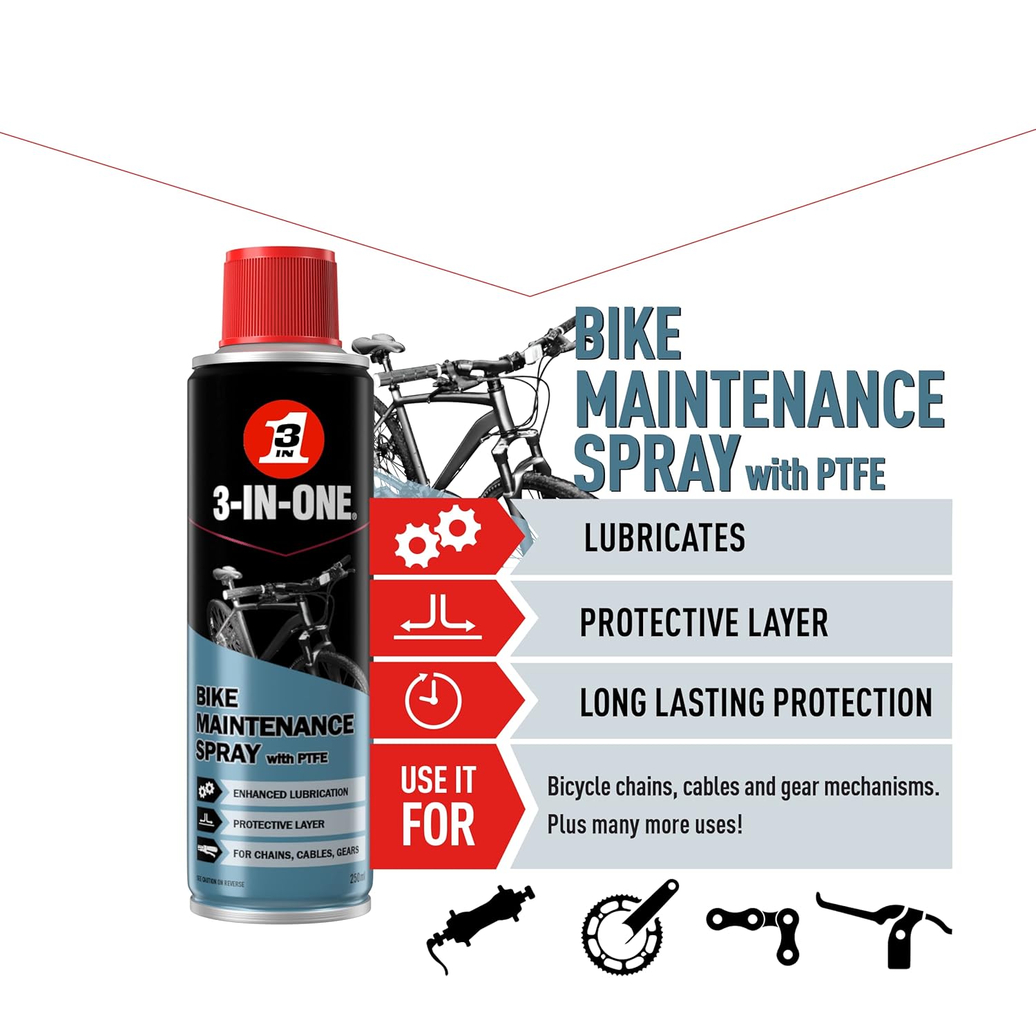 Lubricates bicycle chains smoothly for improved performance and efficiency. PTFE formula reduces friction and enhances component movement. Forms a protective layer against wear and corrosion. Provides long-lasting protection in all riding conditions. Ideal for bicycle chains, gears, and cable mechanisms. Helps extend the lifespan of bike components. Reduces noise from moving bicycle parts. Easy spray application reaches tight and hidden areas. Suitable for regular bike maintenance and servicing. Brand - 3-In-One. Colour - Multicoloured. Size - 250ml.Delivery Information