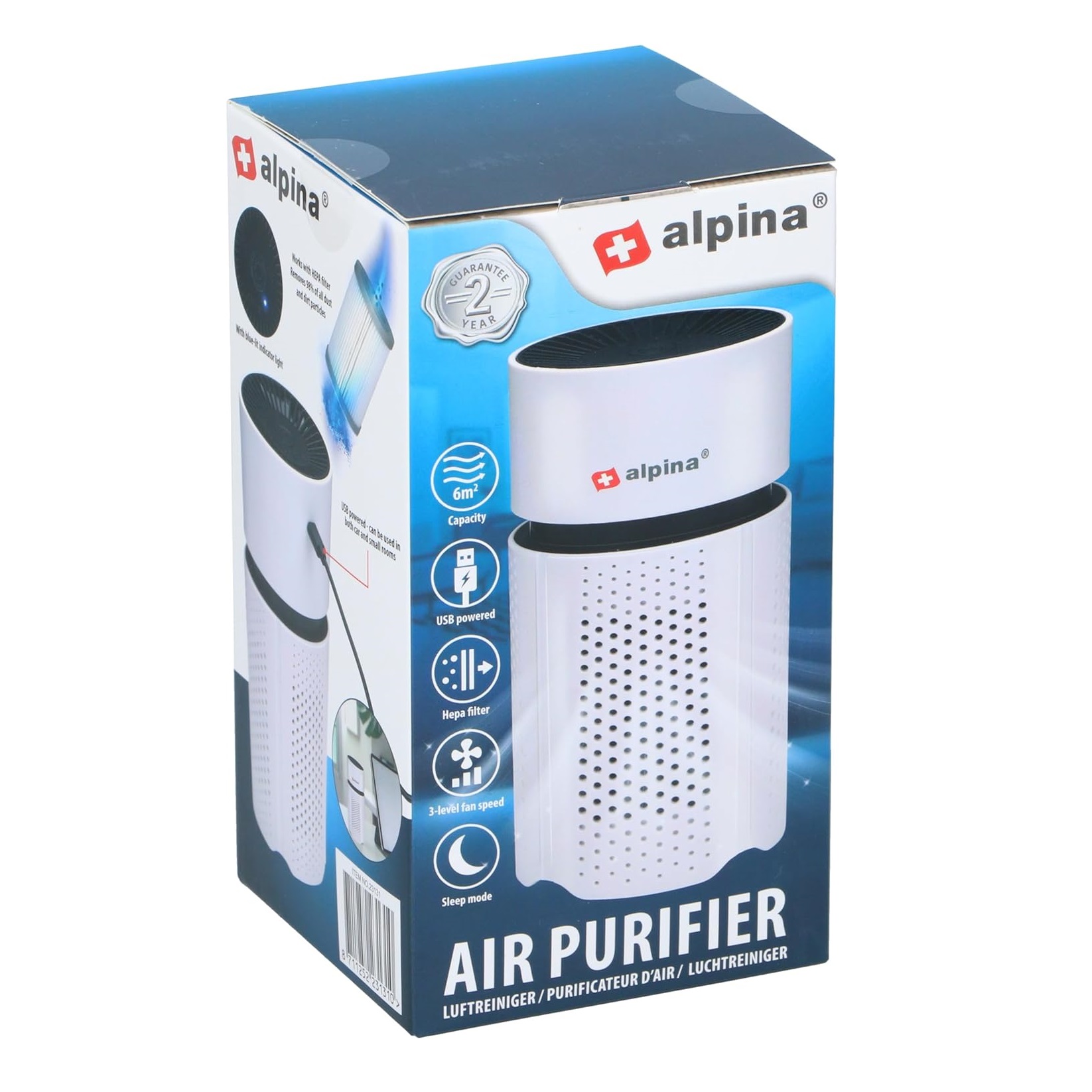 Brand-Alpina. Colour-White. Model Number-23131. Alpina 1.5W USB air purifier. Convenient 1 meter cable length and USB-A plug. Control button with blue lit indicator light. Quiet night mode for a good night rest in clear air. Versatile for spaces up to 6-meter square. 3 different speed settings to customize the airflow. Effectively remove fine particles with advanced H13 type HEPA filter technology. Ideal for small spaces such as the toilet, bathroom or car.Customers Viewing This Page May Be Interested in These Sponsored Links