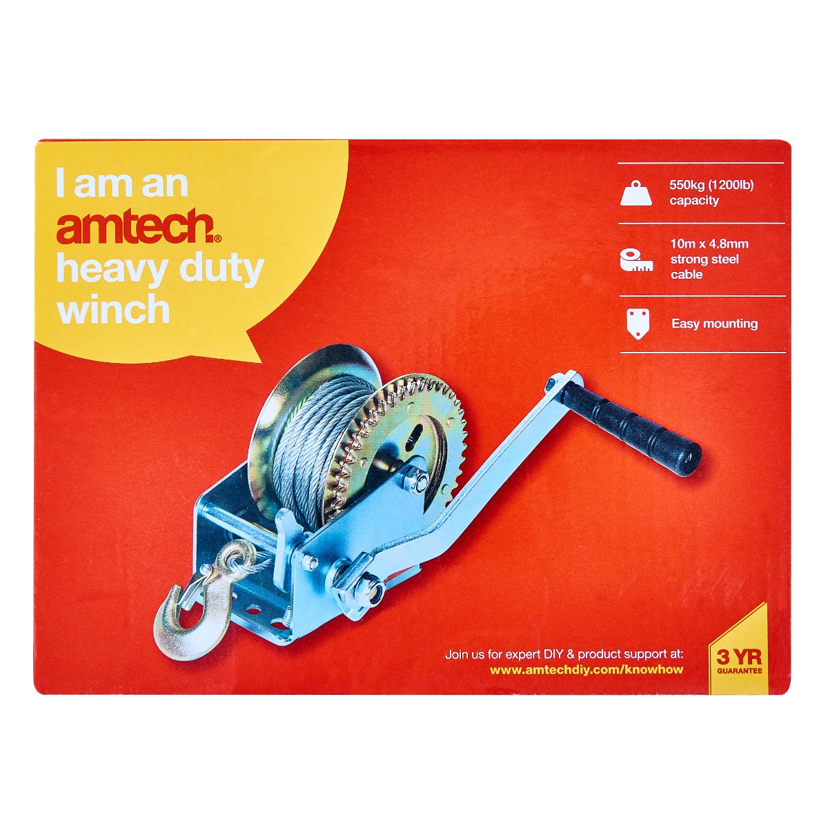 The Amtech Heavy Duty Winch is a versatile and reliable tool designed for a wide range of heavy-duty applications. Perfect for both residential and professional use, this winch can handle a substantial load capacity of up to 1200lbs, making it ideal for tasks that require lifting or securing heavy objects. Whether you are working on your boat, ATV, vehicle, or other machinery, this winch provides smooth, efficient operation that ensures safety and effectiveness. The winch features a smooth ratchet action, which allows for easy and controlled operation when winding the steel cable in or out. This ratchet mechanism is paired with a sure-grip crank handle that provides additional leverage and control, allowing you to quickly and efficiently move heavy items with minimal effort. The locking mechanism ensures that the cable remains securely in place when you need to pause or stop the operation, providing additional safety and peace of mind during use. The Amtech Heavy Duty Winch comes equipped with approximately 10 meters of high-quality, 4.8mm diameter steel cable, providing enough length to handle most jobs while offering exceptional durability and strength. Whether you are pulling a boat onto a trailer or securing large loads, this heavy-duty winch provides the strength and stability required for demanding tasks. The steel cable is designed to resist wear and tear, ensuring long-lasting performance even in rugged environments. Designed for ease of installation and use, the winch comes with five slots in the base that allow for multiple fixing positions. This feature makes mounting the winch onto a range of surfaces or structures quick and simple, ensuring flexibility for different types of projects. Whether you are mounting it on a truck, trailer, or boat, these mounting slots offer the versatility needed for a secure and stable installation. With its impressive 1200lb capacity, reliable components, and practical design features, the Amtech Heavy Duty Winch 1200lb is a must-have tool for anyone who needs to move heavy items safely and efficiently. Its easy mounting system and durable construction make it suitable for a variety of applications, from personal use to professional setups. Whether you are lifting heavy machinery, securing vehicles, or moving bulky loads, this winch provides the power and reliability you need for the job.