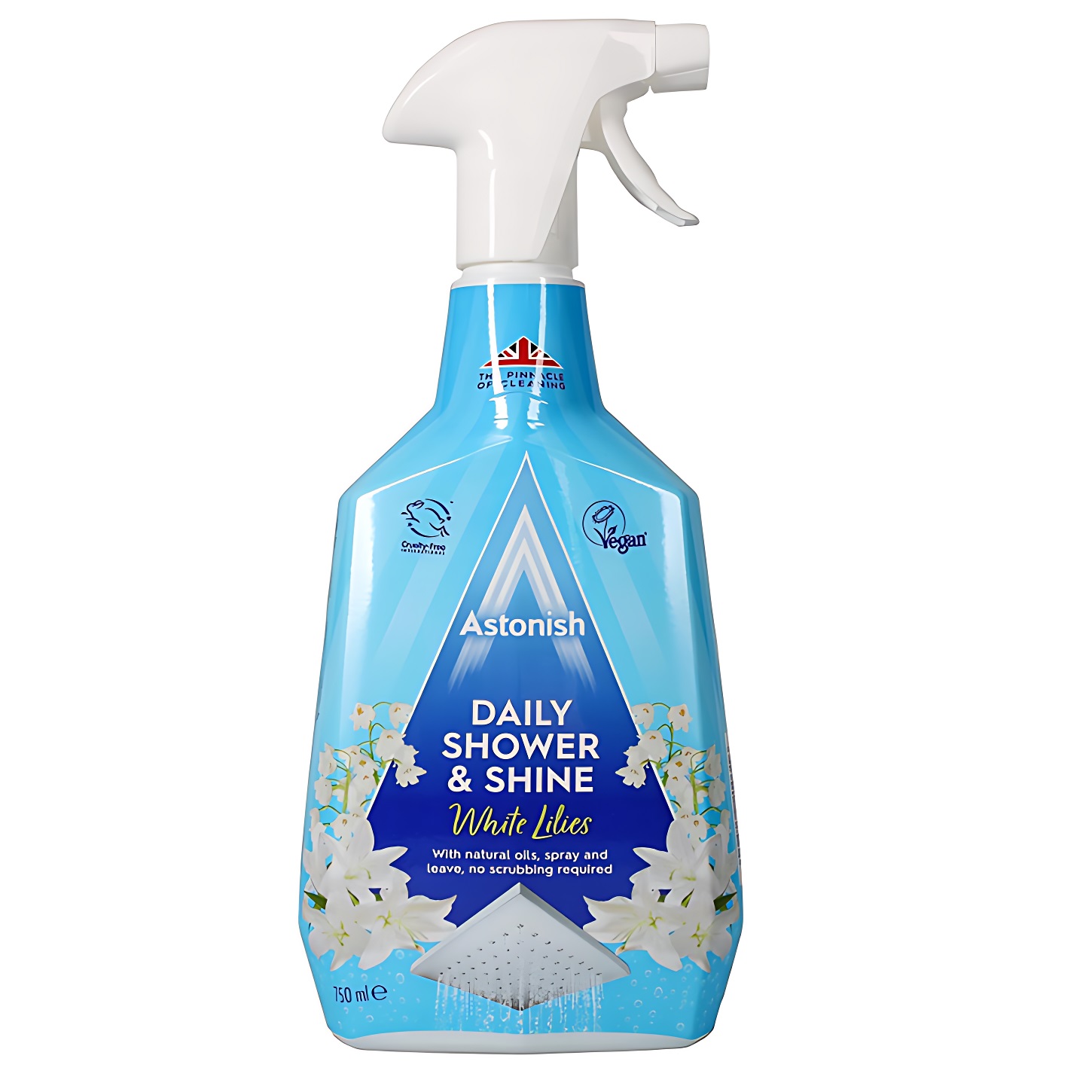 Cleaning the bathroom is often cited as the most dreaded household chore, particularly the grueling task of scrubbing down soap scum and limescale from shower doors. The Astonish Daily Shower & Shine in White Lilies transforms this experience entirely. Rather than waiting for grime to build up, this "preventative" cleaner acts as a daily shield for your bathroom. By spending just ten seconds misting your shower after every use, you can effectively retire your heavy-duty scrub brushes and harsh chemical descalers. What sets this specific variant apart is the infusion of natural oils and the delicate fragrance of White Lilies. While many bathroom cleaners leave behind a medicinal or overpowering bleach odor, Astonish provides a sophisticated floral aroma that lingers, turning your bathroom into a spa-like sanctuary. The formula is designed to be tough on minerals but gentle on the senses. It utilizes surfactants that lower the surface tension of water droplets, ensuring they sheet off the walls rather than evaporating and leaving behind unsightly "leopard spots" of limescale. Modern bathrooms utilize a wide variety of materials, from tempered glass and chrome fixtures to vinyl curtains and acrylic trays. The Astonish Daily Shower Shine is remarkably versatile, making it a one-bottle solution. It is non-abrasive, meaning it will not scratch delicate plastic surfaces or degrade the grout between your tiles. Whether you have a high-end walk-in wet room or a standard bathtub setup, this spray ensures that every inch—from the showerhead to the drain—remains free from the cloudy film of soap scum. In an era where consumers are more conscious of their environmental footprint, Astonish leads the way. This product is Cruelty-Free and Vegan Society Approved, ensuring that your sparkling clean home does not come at the cost of animal welfare. The bottle is fully recyclable, and the formula itself is designed to be biodegradable. By using a spray and leave product, you are also reducing the amount of water used during the cleaning process, contributing to a more sustainable household routine. Using the Astonish Daily Shower & Shine is incredibly simple. After showering, while the surfaces are still wet, mist the spray over all internal surfaces including the glass, tiles, and the shower tray. There is no need to scrub or rinse. The fine mist will mix with the moisture on the walls to create a protective coating as it dries. For areas with particularly hard water, consistent daily use will gradually break down existing light deposits and prevent new ones from forming, eventually restoring the original luster of your bathroom fixtures.