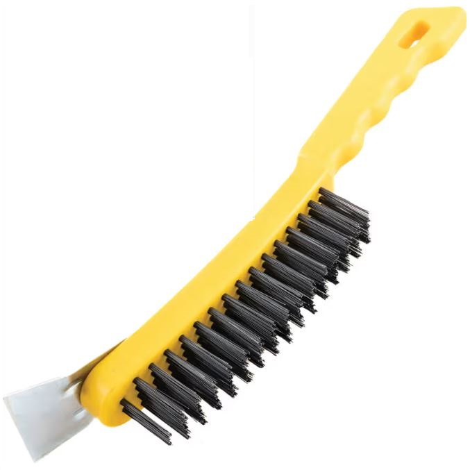 Equipped with four rows of sturdy wire bristles, providing effective cleaning power for tough dirt and grime. Manufactured with high-quality materials, ensuring durability and long-lasting performance. Features a plastic handle that offers a comfortable grip and allows for precise control during use. Includes a metal scraper for removing stubborn residue and debris, enhancing the brush versatility. Ideal for a variety of cleaning tasks, including removing rust, paint, and scale from metal surfaces, cleaning grout, and scrubbing tough stains. Suitable for use in workshops, garages, kitchens, bathrooms, and outdoor spaces, providing versatility for different cleaning needs. Simple and straightforward to use, making it suitable for both professional and DIY applications. Brand - Blackspur. Colour - Yellow and Black.Delivery Information