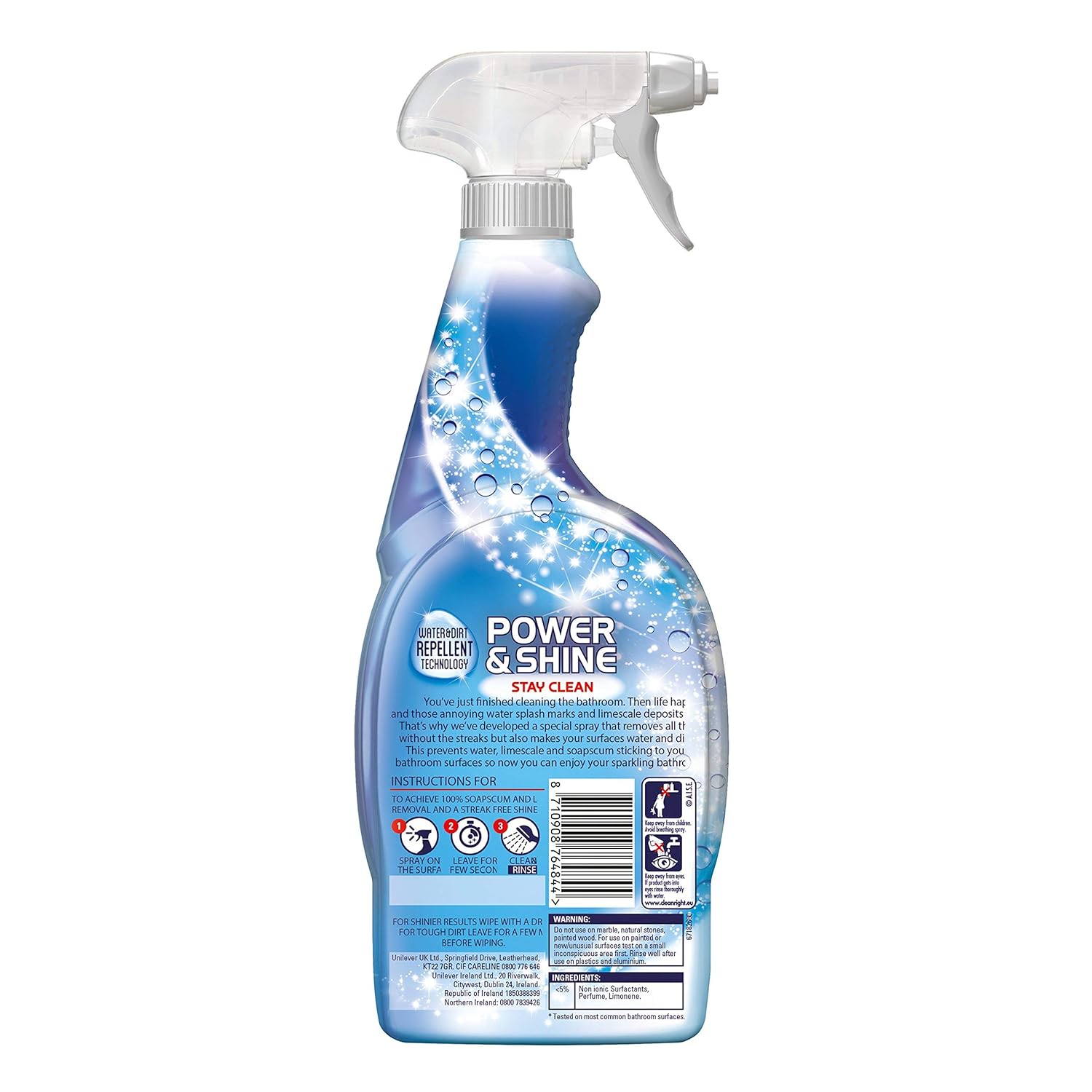 The Cif Power and Shine Bathroom Cleaner Spray is a fast-acting, powerful cleaning solution designed to keep your bathroom sparkling clean every day. Its advanced formula effectively removes stubborn limescale, soap scum, and everyday grime, leaving surfaces looking fresh and hygienic with minimal effort. Ideal for daily use, this spray ensures your bathroom remains spotless while helping maintain high hygiene standards. Equipped with water and dirt repellent technology, Cif Power and Shine helps surfaces stay cleaner for longer, reducing the frequency of cleaning while keeping tiles, sinks, showers, and taps looking streak-free and polished. The powerful spray action allows grime and build-up to be tackled quickly, requiring only light wiping to achieve a shiny, clean finish. This versatile cleaner is suitable for a wide range of bathroom surfaces, including ceramic, chrome, and enamel, making it safe for everyday use on your fixtures and fittings. Its easy-to-use spray format ensures convenient application, providing effective results with minimal effort.