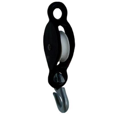 Robust malleable iron construction. High breaking strength. Wide nylon wheel. Extra strong hook. Easy to install. Size measures approximately 1.5”.
