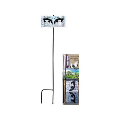 Rotating bird repeller with reflective flash and predator eyes. Wind powered for silent deterrent. Protects any area where birds are a problem. Easy set-up with ground anchor mounting pole.