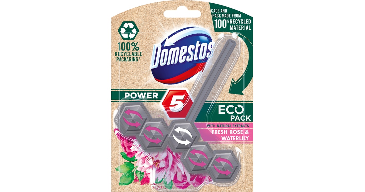 The Domestos power eco pack toilet freshener offers efficiency like other power fresheners, but in a more responsible 100 percent recycled packaging.