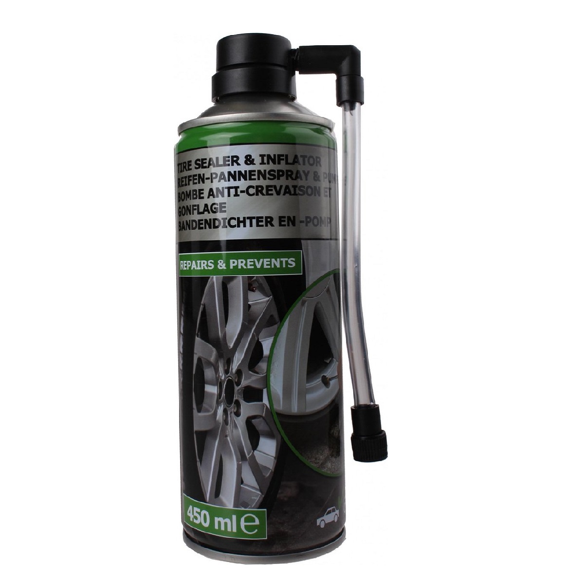 The Edco Tire Sealer and Inflater in Silver offers a convenient and user-friendly solution for emergency tire repairs on tubeless tires, ensuring you stay safely on the road until you can reach a garage for a permanent fix. This tire repair spray is designed to be easily applied without the need for dismantling the tire, providing quick and efficient repairs when you need them most. Crafted from high-quality materials, this tire sealer and inflater spray is based on rubber, offering reliable performance and durability. The rubber-based formula effectively seals punctures and leaks, helping to reinflate the tire and restore proper pressure for continued safe driving. Whether you are driving a car or motorcycle, this versatile tire sealer and inflater spray is suitable for use on various types of vehicles. The 450ml canister is compact and lightweight, making it easy to store in your vehicle trunk or glove compartment for convenient access whenever needed. In the event of a tire emergency, simply apply the Edco Tire Sealer and Inflater spray to the affected tire, following the instructions provided on the label. The user-friendly design ensures hassle-free application, allowing you to quickly address punctures or leaks and continue your journey with minimal interruption. Constructed from durable aluminum, the canister of this tire sealer and inflater spray is built to withstand the demands of automotive use, ensuring long-lasting reliability and performance. Whether you are traveling long distances or navigating urban streets, you can rely on the Edco Tire Sealer and Inflater to provide effective emergency tire repairs whenever you need them.