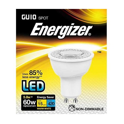Energy efficient LED bulb replaces traditional 60-watt halogen spotlight lamps. Warm white light creates comfortable welcoming ambience for living spaces. 5.8-watt power consumption delivers bright illumination while reducing energy usage. 420 lumens output provides clear focused lighting for everyday tasks. Long lasting LED technology offers up to fifteen year lifespan. Non dimmable design ensures consistent brightness without flicker or variation. GU10 cap fitting allows quick installation in compatible spotlight fixtures. Instant full brightness achieved immediately without warm up delay time. Mercury free construction supports safer disposal and environmentally friendly use. Brand - Energizer. Colour - White.Customers Viewing This Page May Be Interested in These Sponsored Links