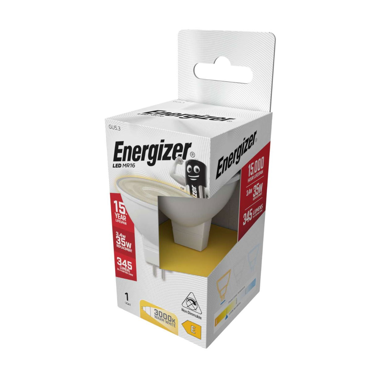 Energy efficient 3.4-watt LED replaces traditional 35-watt halogen bulbs. Suitable for residential and commercial lighting installations. Warm white 3000K light creates comfortable and inviting atmosphere. Produces bright 345 lumens for clear, focused illumination. GU5.3 MR16 base fits compatible low voltage light fittings. Long lasting LED technology offers up to 15000-hours lifespan. Non dimmable bulb ensures consistent and stable light output. Ideal for kitchens, living rooms, and accent lighting applications. Mercury free construction makes this bulb safer and environmentally friendly. Brand - Energizer. Colour - White.Customers Viewing This Page May Be Interested in These Sponsored Links