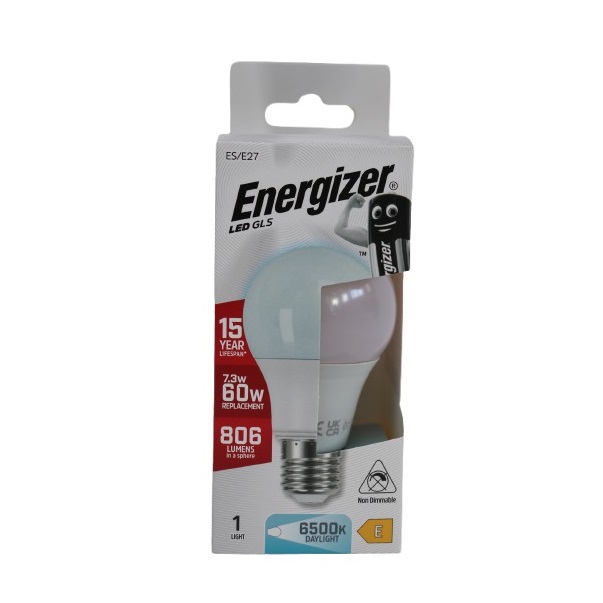 Energy efficient 7.3-watt LED replaces traditional 60-watt bulbs. Bright 806 lumens provide clear day light illumination. Neutral 6500k day light suits everyday indoor lighting. Long lasting bulb offers up to 15-year lifespan. Rated for approximately 15000-hours of reliable use. Standard ES-E27 bayonet cap fits common fixtures. Instant full brightness with no warm-up delay. Brand - Energizer. Colour - White Size - 112mm x 60mm.