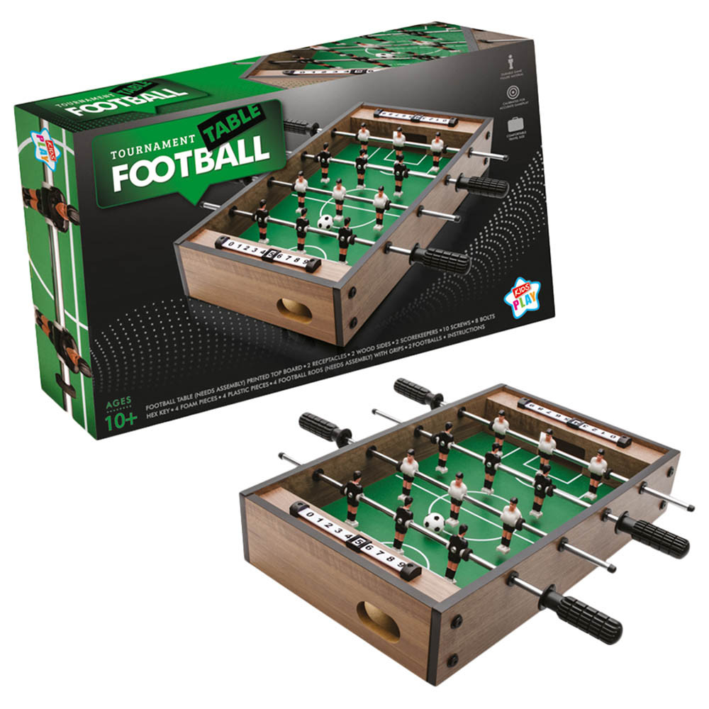 Tournament table football. Convenient scoring units. Comfortable grip bar handles. Elegant wood finish. Table has printed top board, 2 receptacles, 2 wood sides, 2 scorekeepers. Requires assembly, hex key provided. 2 footballs, easy access for football return. Calibrated for accurate game play. Durable game figure material.