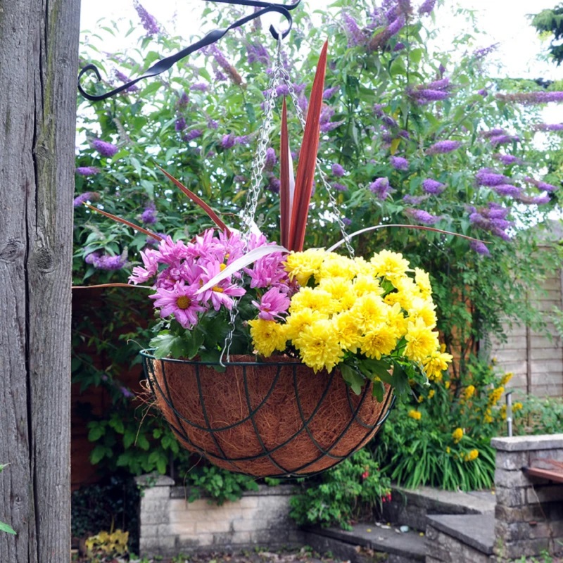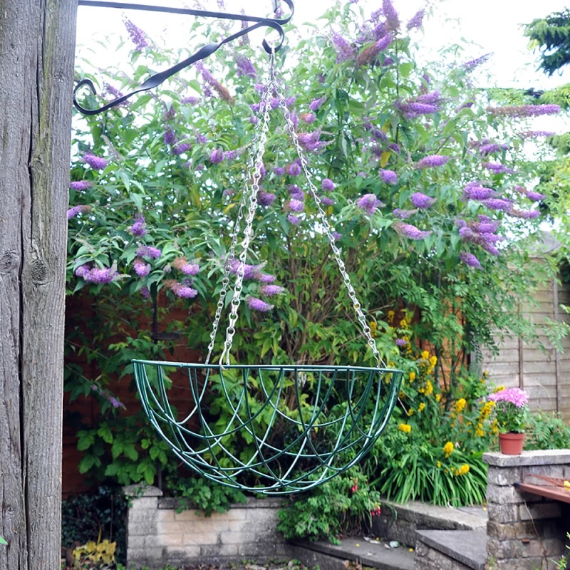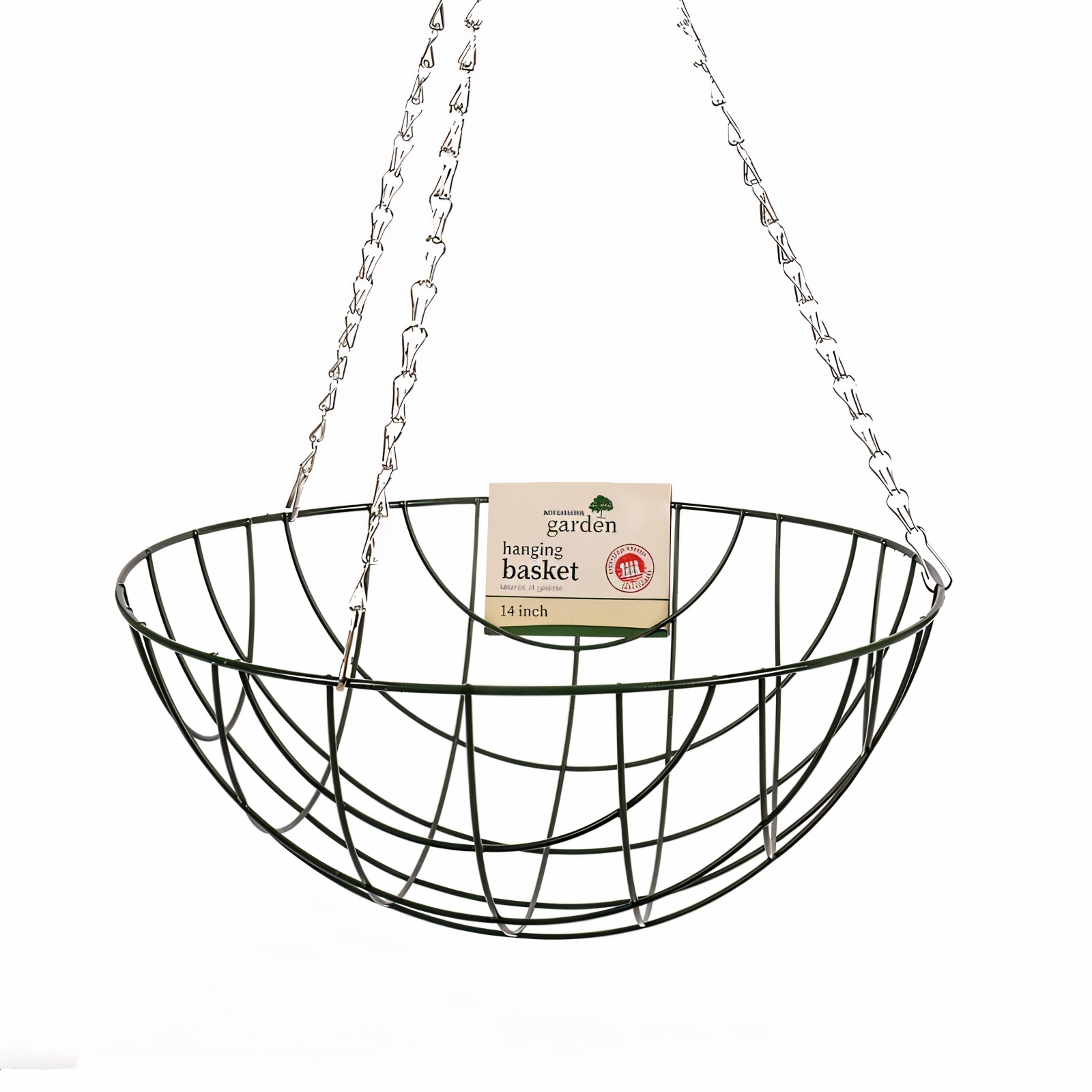 Traditional round hanging basket with 14-inch diameter. Made from durable medium-weight metal wire. Coated with green plastic for weather resistance. Triple hanging chain ensures even weight distribution. Chains are plated for added protection against the elements. Strong frame designed to hold shape over time. Open wire structure allows planting through sides. Suitable for use with coco liners, jute, moss, or pre-formed liners. Provides excellent drainage and root aeration. Ideal for seasonal flowers, trailing plants, or herbs. Holds sufficient compost for healthy plant growth. Large size helps retain more water, reducing frequent watering. Easy to hang and reposition around garden or balcony. Blends naturally into garden surroundings. Perfect for patios, porches, balconies, fences, and walls.Delivery Information