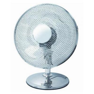 Powerful, silent and efficient cooling. Three-speed dial switch operation. Vertical tilt. 90º oscillation. Fixed position option. Transparent blades. Secure chrome safety grill. Non-scratch base. Carrying handle. Size measures approximately 12” (30.5cm). Operates on 220V-240V 50Hz AC mains.