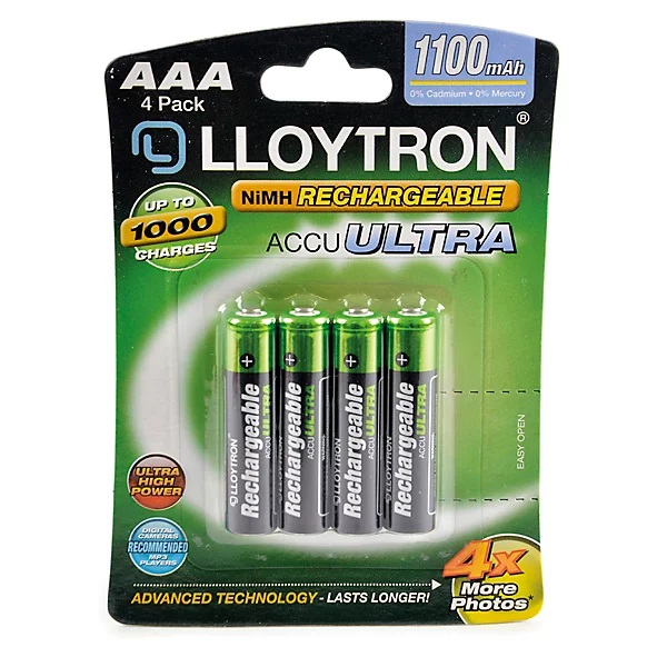 High-capacity 1100mAh AAA batteries deliver long-lasting, reliable power. Rechargeable NiMH technology reduces waste and saves money. Supports up to 1000 recharge cycles for extended battery life. Advanced Accu Ultra technology ensures consistent performance. Ideal for remotes, toys, cameras, and everyday devices. Low self-discharge design retains power when not in use. Suitable for home, office, and travel applications. Rechargeable batteries help reduce environmental impact. Brand - Lloytron. Colour - Green and Black. Pack of 4.Customers Viewing This Page May Be Interested in These Sponsored Links