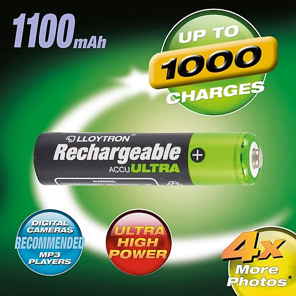 Power your everyday devices with Lloytron AAA NiMH Accu Ultra Batteries, designed for dependable performance and long-lasting energy. With a high-capacity 1100mAh output, these AAA rechargeable batteries deliver consistent power for frequently used electronics, from TV remotes and wireless controllers to toys, cameras, and portable gadgets. Built using advanced NiMH (Nickel Metal Hydride) technology, Lloytron Accu Ultra batteries provide a reliable and eco-friendly alternative to disposable batteries. Each battery supports up to 1000 recharge cycles, helping you save money over time while significantly reducing household waste. The low self-discharge design ensures the batteries retain their charge even when not in regular use, making them ideal for both daily essentials and backup devices. Engineered for stable voltage output, Accu Ultra technology ensures smooth, efficient performance across a wide range of applications. Whether used at home, in the office, or while traveling, these batteries are built to keep your devices running longer and more efficiently.