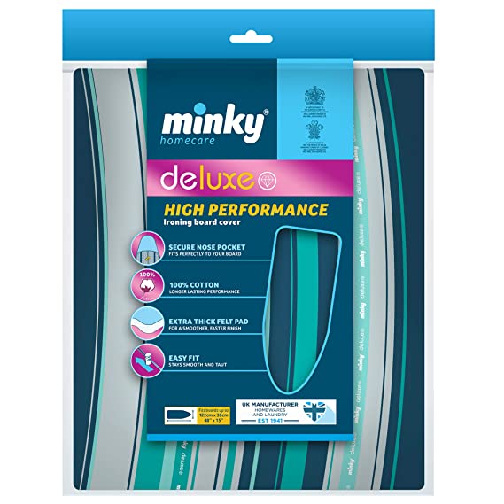 Brand - Minky Deluxe. Type - high performance ironing board cover. Colour - grey. Dimensions - 48 x 15-inch. Fits boards up to 122 x 38cm. Fits securely around your board. Distinct designed nose pocket. Hardwearing and durable. 100 percent cotton. Smoother ironing surface. Thick felt backing. Snug fit nose pocket. Pull to fit toggle fastening. Luxuriously thick pad. Eye-catching design. Model number - R79752005. EAN - 5010353316760.Customers Viewing This Page May Be Interested in These Sponsored Links
