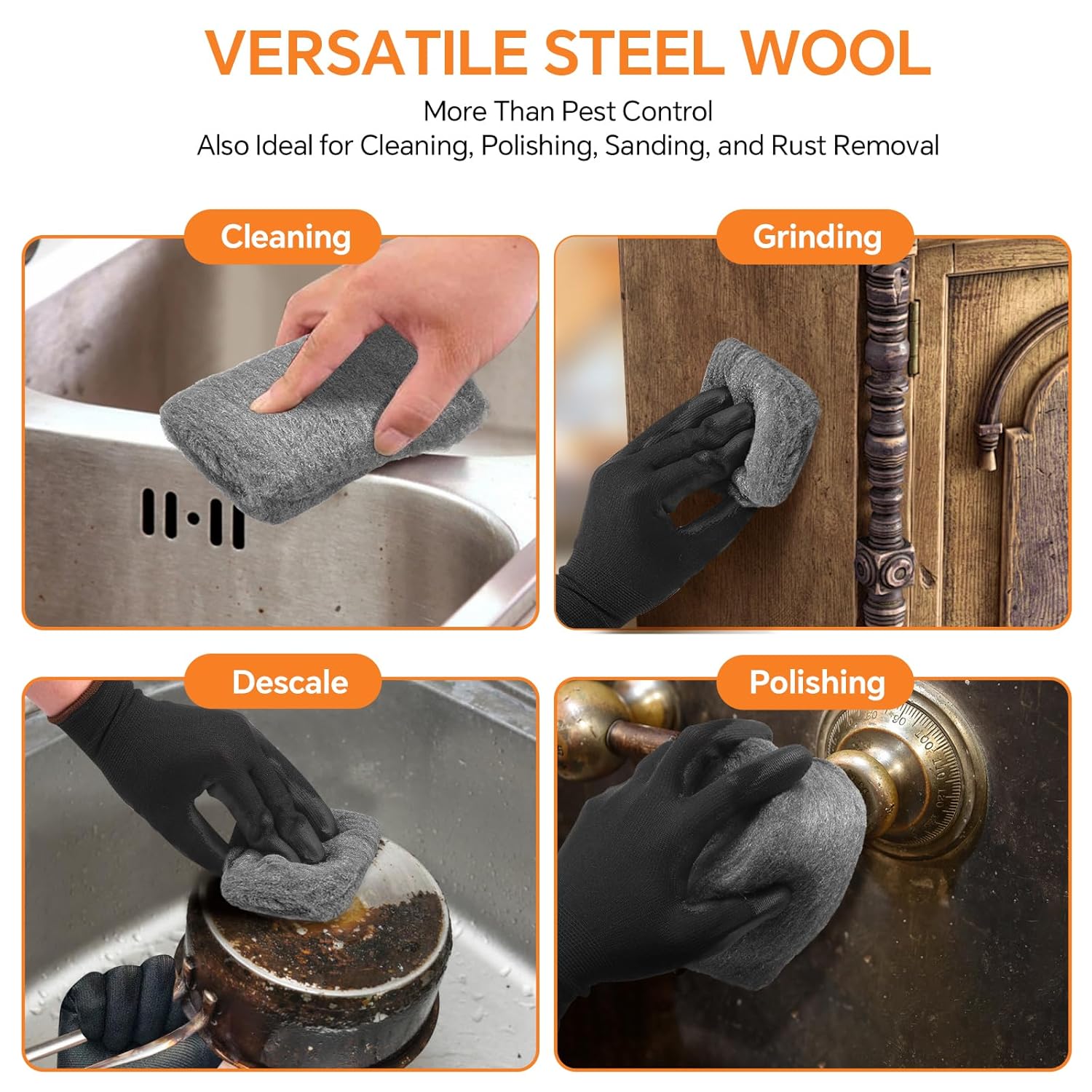Suitable for wood, metal, glass. Ideal for cleaning tough surfaces. Perfect for polishing metal fixtures. Removes stubborn rust with ease. Great for sanding wooden furniture. Descaling pots and pans effortlessly. Multi-purpose use around the home. Excellent for craft and DIY. Handy for pest control sealing. Brand - National Abrasives. Colour - Grey. Size - 150g.Delivery Information
