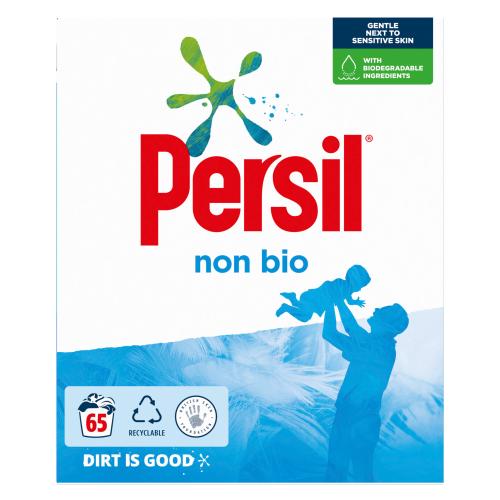 Persil Non-Bio powder - 65 Wash is gentle next to skin but tough on stains. It also provides great results at lower temperatures. With cooler, quicker washes, Persil non biological washing powder can help you save time and energy while still leaving your clothes fresh and clean.