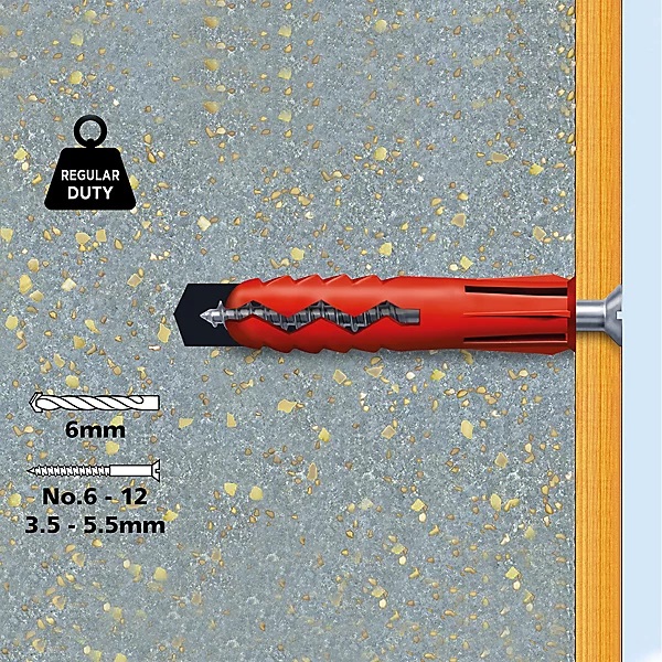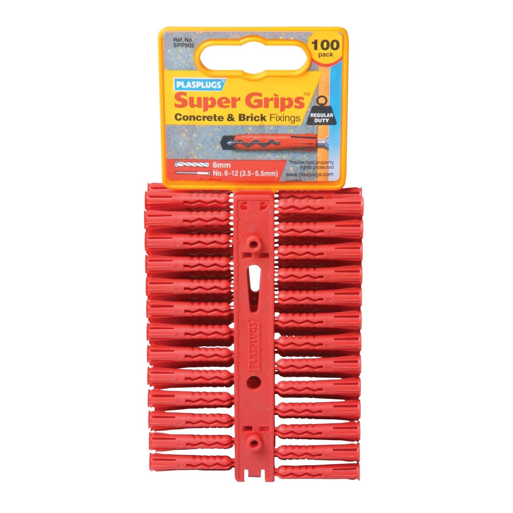 Strong wall plugs for secure masonry fixing. Designed for concrete, brick and solid stone walls. Super grip design ensures firm and reliable hold. Regular duty fixings suitable for everyday applications. Compatible with No.6 to No.12 screws sizes. Expanding body provides maximum grip inside drilled holes. Durable plastic construction resists cracking and splitting. Suitable for DIY projects and professional installations. Ideal for shelves, brackets, lights and fixtures. Brand - Plasplugs. Colour - Red. Size - 6mm. Pack of 100.Delivery Information