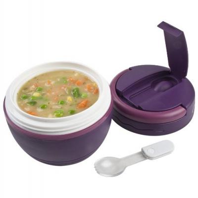 Generous size container perfect for single serving for soups or other hot food. Keeps contents warm for up to 4 hours - ideal for lunch. Bowl suitable for reheating in microwave. Folding spoon/ fork inside lid. Divided removable dish. 500ml capacity.