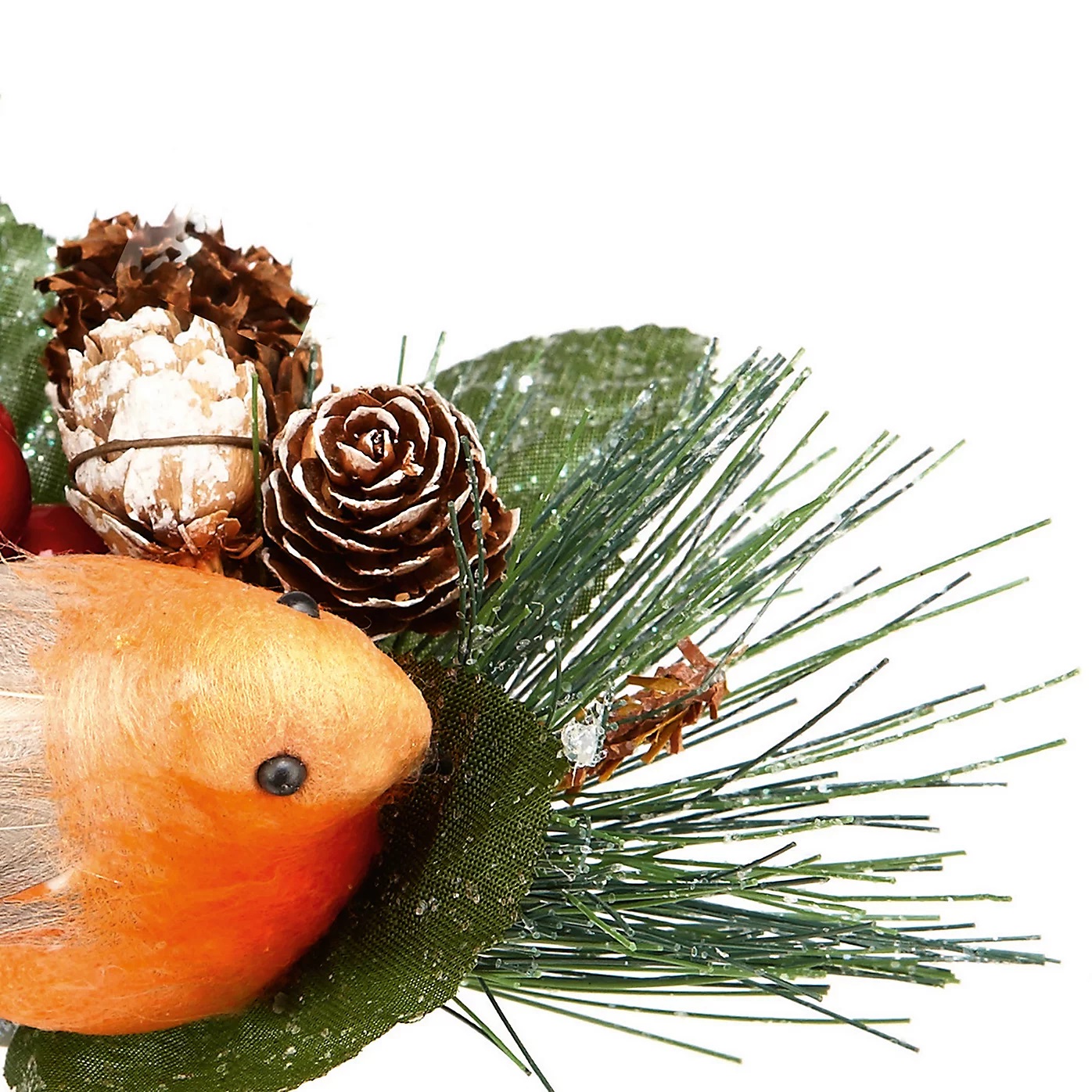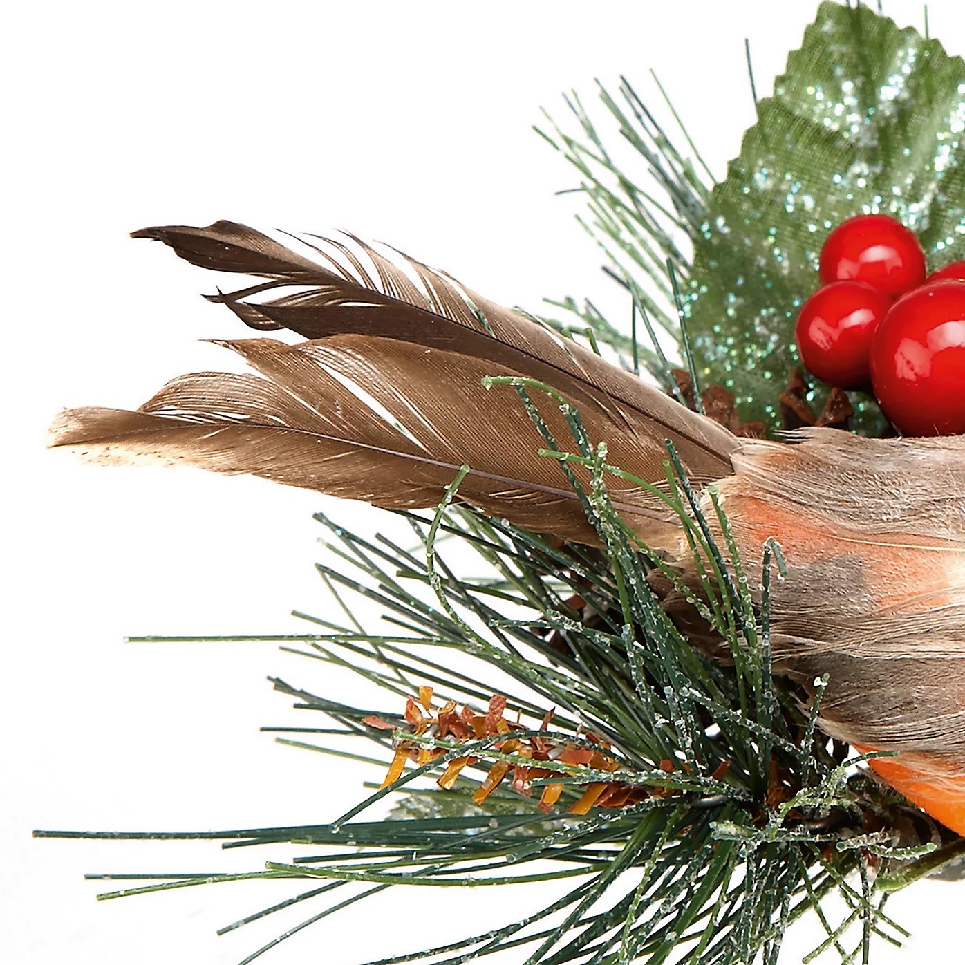 Add a touch of festive charm to your holiday decor with this Premier Artificial Robin with Pine Cone and Faux Foliage. Featuring a lifelike robin perched amidst realistic faux greenery, this decorative piece brings a natural yet whimsical feel to any setting. Perfect for wreaths, floral arrangements, or holiday table centerpieces, its versatility ensures it will complement a wide range of indoor Christmas decorations. The robin vibrant colors and intricate detailing make it a standout addition, while the accompanying pine cone and faux foliage create a beautifully balanced, nature-inspired look. Lightweight and easy to position, this ornament can be effortlessly incorporated into your existing decor, whether it is for a mantel, tree, or festive centerpiece. Crafted to seamlessly blend with traditional and modern holiday styles, this artificial robin is a delightful choice for those seeking an elegant and low-maintenance seasonal touch. Ready to display right out of the box, it is the perfect finishing accent to bring warmth and joy to your home during the most wonderful time of the year. Ideal for those who appreciate the beauty of nature and want to add a realistic, enduring piece to their seasonal decorations.