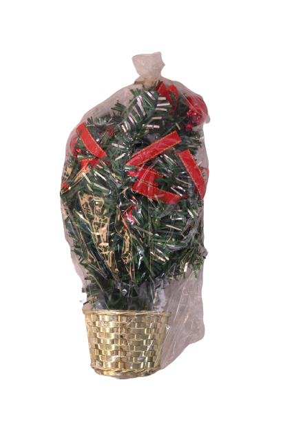 Green tree with silver tinsel flecks in red color, decorations, and pine cones. Comes in a gold basket. Indoor use. Great for home, office, school or bedroom.