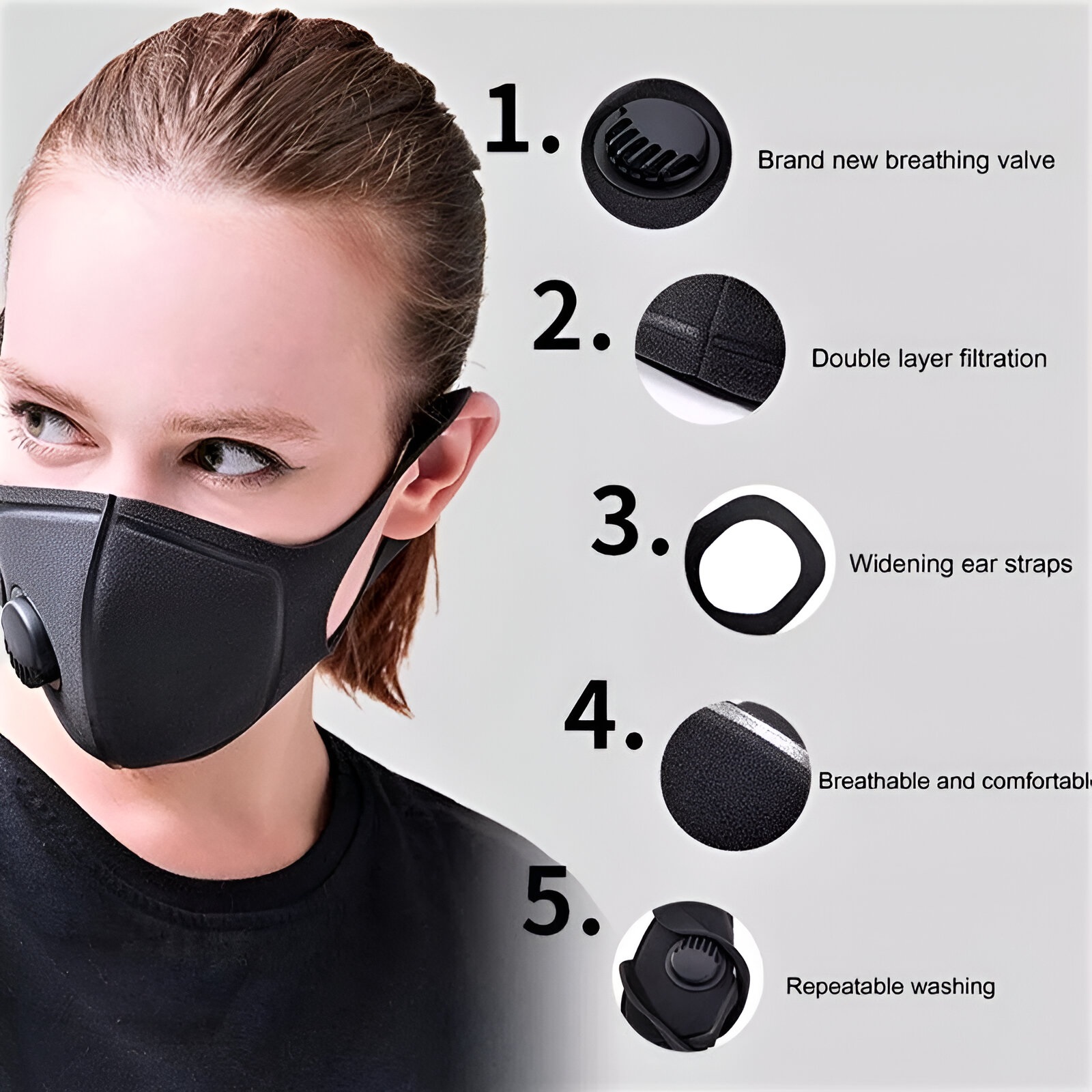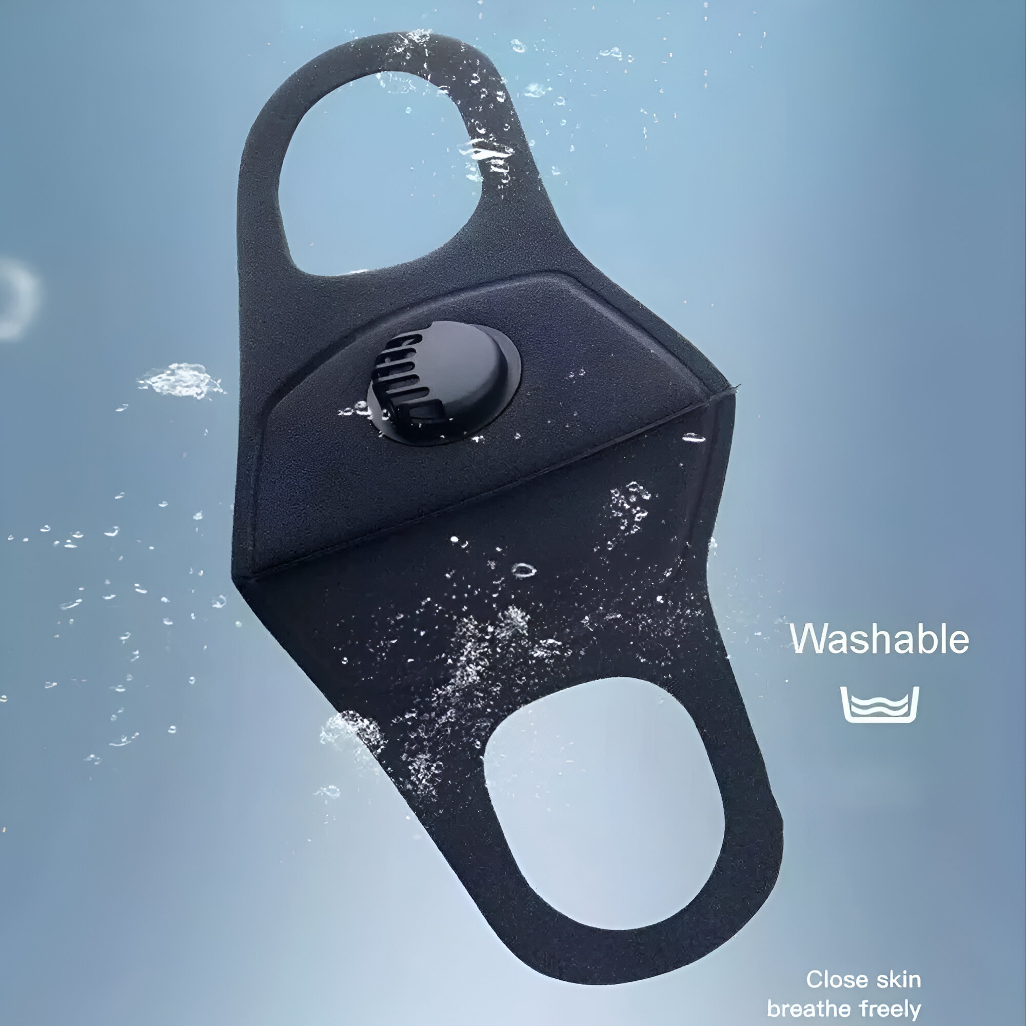 Stay protected in style and comfort with our Reusable Air Pollution Face Mask with PM2.5 Breathing Valve in classic black. Crafted from high-quality elastic fibres, this breathable mask is designed to provide a snug yet comfortable fit while effectively filtering out airborne particles. Whether you are commuting through the city, cycling along a trail, or simply going about your daily routine, this mask offers reliable protection from environmental pollutants and irritants. The mask features a built-in breathing valve that allows air to flow freely while preventing moisture and heat build-up inside the mask. This smart ventilation system ensures smoother and easier breathing, even during prolonged wear. The elastic ear loops are soft, wide, and designed to sit gently around your ears without causing discomfort – ideal for wearing throughout the day. This reusable mask is a practical choice for year-round use, especially during spring and summer when pollen and allergens are more prevalent. Its lightweight, foldable design makes it easy to carry in your pocket, bag, or glove compartment, so you are always prepared wherever you go. Engineered with a fine particle filtration system, this face mask helps block out common airborne contaminants such as dust, pollen, smoke, haze, and vehicle exhaust. It also helps protect against passive smoking and provides some protection in environments with PM2.5 levels. The elastic fibres fit closely to the contours of your face, ensuring a secure and comfortable seal. More than just functional, this mask is also a sustainable choice. It is washable and reusable, making it a great alternative to disposable paper masks that contribute to environmental waste. With proper care, this mask can be reused multiple times without compromising on comfort or performance. Perfect for outdoor enthusiasts and urban commuters alike, the mask is suitable for various activities such as cycling, running, hiking, carpentry, and even skiing. Whether you are navigating the hustle and bustle of city life or venturing outdoors, this face mask provides the extra layer of protection and peace of mind you need. Each element of this face mask has been carefully considered to provide maximum comfort, optimal breathability, and dependable protection. From its elastic ear loops to its soft sponge interior, every detail works together to ensure that your experience wearing this mask is as comfortable as it is safe. This reusable air pollution face mask is more than just a protective accessory—it is an essential part of everyday life in today world. Compact, durable, and stylish, it is the ideal choice for anyone who wants to take proactive steps toward personal health and wellbeing.