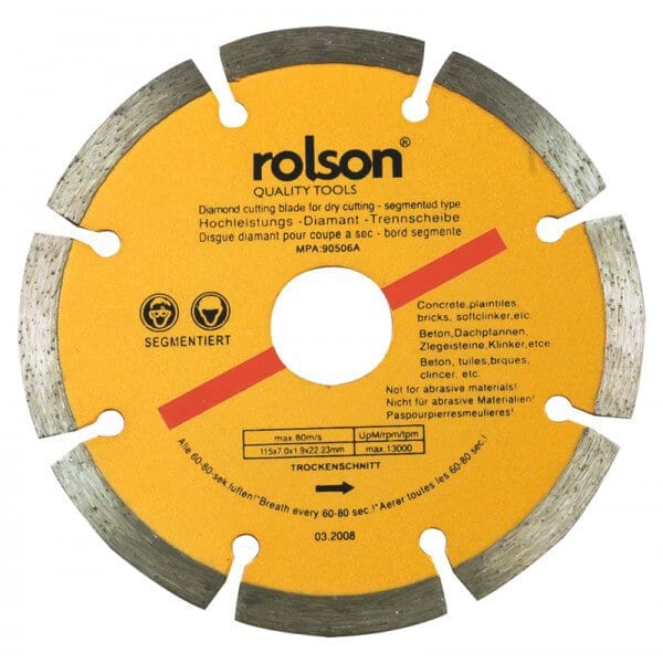 Segmented diamond blade delivers fast efficient cutting on tough materials. Ideal for cutting concrete brick stone tiles and masonry surfaces. Strong segmented rim improves airflow and reduces heat buildup. Designed for reliable performance with angle grinders and cutters. Diamond cutting edge ensures clean precise cuts with minimal effort. Suitable for professional tradespeople and DIY home improvement projects. Robust blade handles heavy duty cutting without premature wear. Efficient cutting action saves time on construction renovation tasks. Brand - Rolson. Colour - Yellow. Size - 115mm.Delivery Information
