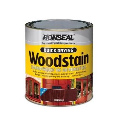 Ronseal Quick Drying Woodstain is the simplest way to colour and protect your exterior wood in one easy step. Easy to apply it is rainproof in only 30 minutes and ideal for completing jobs quickly. Furthermore it is highly water repellent and protects the wood from the suns harmful UV rays. · Rainproof in 30 minutes. · Easy to apply. · Beautifies and protects wood. · Resists cracking peeling and blistering. · Brushes wash out in water. · Longer lasting. · Suitable for use on bare or previously stained wood. · Ideal for doors window frames cladding garden furniture and all smoothed timber. · It will cover approximately 16 to 20m² per litre used.