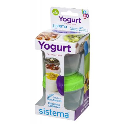 Brand - Sistema. Type - to go colourful yogurt and snack containers. Capacity - 5.07oz 150ml. Pack of 2-pieces. Capacity - 150ml or 5.07oz. Seal-tight and screw top lid. Phthalate and BPA free. Portable and microwave safe. Perfect for yogurt, snacks, baby food, leftovers and much more. Fridge and freezer safe. Model number - 21466. EAN - 9414202214669.Customers Viewing This Page May Be Interested in These Sponsored Links