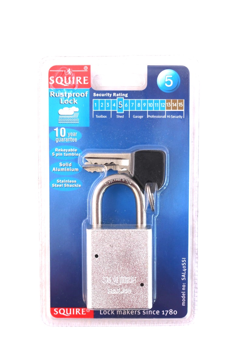Brand-Squire Type-rustproof padlock with 2 keys Colour-silver Size-38mm Eye-catching design Durable and long-lasting Model number-SAL40SSI EAN-5012245020397