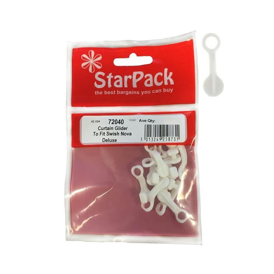 Designed for Swish Nova Deluxe tracks. Smooth gliding action ensures effortless curtain opening and closing. Durable plastic construction offers reliable long lasting everyday performance. Easy to install without tools or professional assistance required. Secure hook design holds curtains firmly in place. Compatible specifically with Swish Nova Deluxe curtain track systems. Suitable for home office bedroom and living room curtains. Provides smooth quiet movement without snagging or sticking. Brand - StarPack. Colour - White. Pack of 8.Delivery Information
