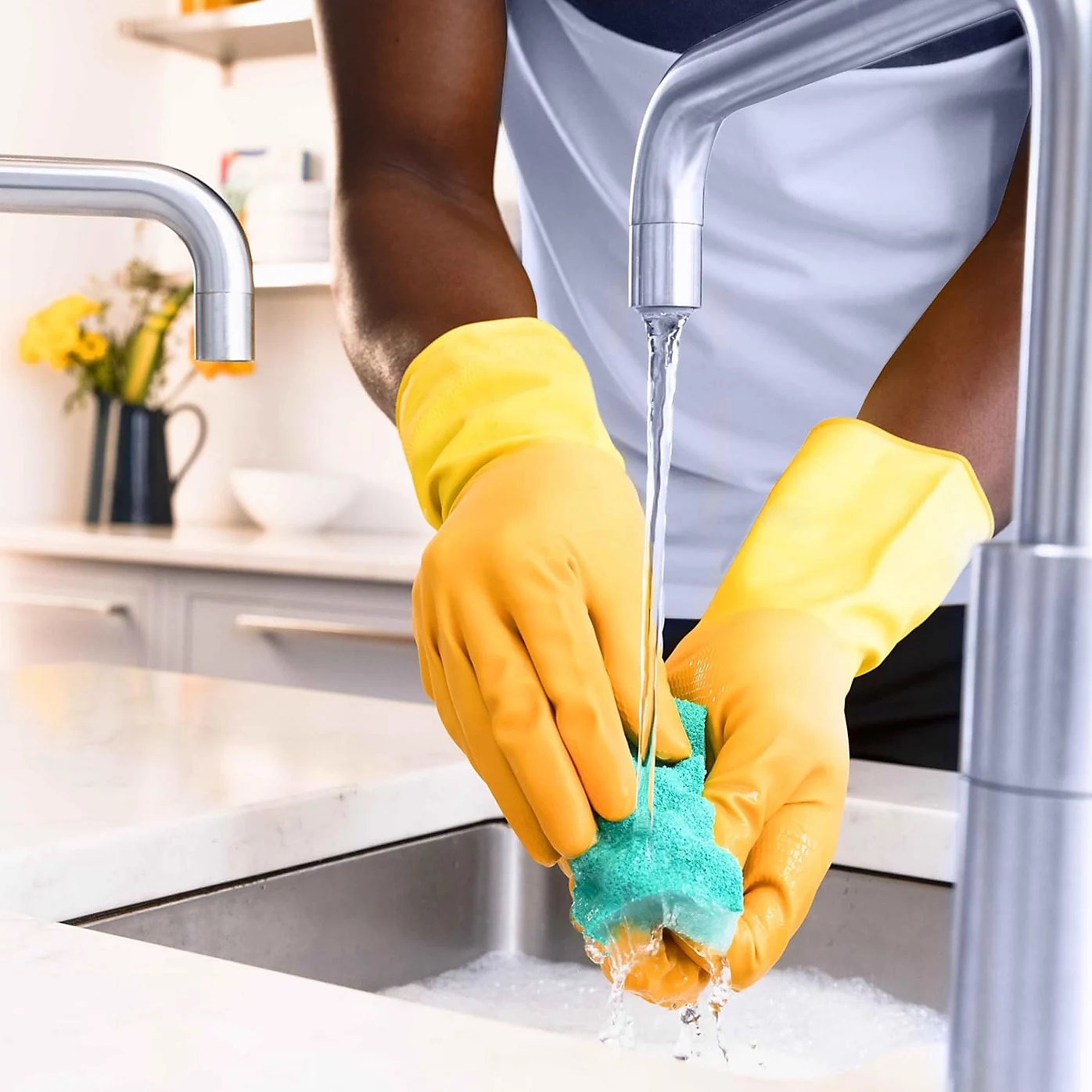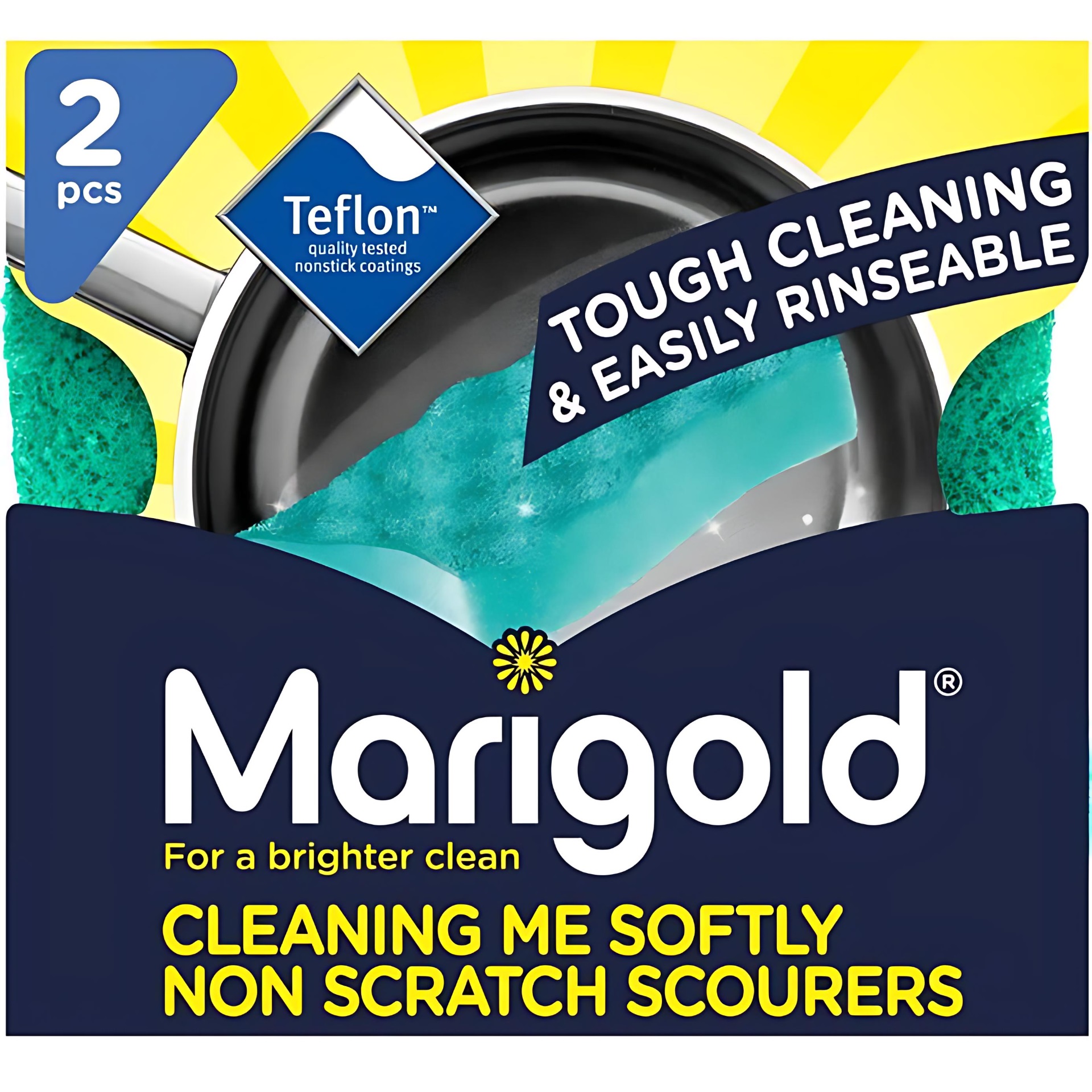 Experience a new level of cleaning confidence with the Teflon Marigold Non-Scratch Pads in Green, Pack of 2. These specially designed pads are crafted to deliver powerful cleaning action without damaging delicate surfaces. Whether you are scrubbing non-stick pans, wiping bathroom tiles, or refreshing glass surfaces, these pads provide a safer and smarter solution for your everyday cleaning needs. Marigold Cleaning Me Softly scourers are foam-backed to provide a soft and ergonomic grip that fits comfortably in your hand. This ensures easy handling, improved control, and less strain while cleaning. The non-scratch scouring surface offers effective performance on stubborn grime, burnt-on food, soap scum, and more, without leaving scratches or marks. Their gentle yet tough construction makes them suitable for a wide variety of surfaces, including non-stick cookware, ceramic tiles, glass, stainless steel, enamel, and coated pans. What sets these scourers apart is their Teflon approval. Being Teflon approved means they have been tested and proven safe for use on non-stick surfaces, giving you peace of mind that your cookware is protected during every scrub. You can confidently use these pads on expensive kitchenware and delicate surfaces, knowing they will not cause damage. These scourers are incredibly easy to rinse clean after each use. Unlike traditional scourers that trap food particles and become dirty quickly, the Marigold Non-Scratch Pads are designed with a rinsable surface that helps them stay fresher for longer. This reduces odour build-up, minimises bacteria, and makes them a more hygienic and practical option for frequent use. Each pad in this pack of two is highly durable and built to withstand repeated use without breaking down or losing its effectiveness. Whether you are cleaning up after cooking, tackling deep bathroom cleans, or refreshing household surfaces, they remain reliable and efficient throughout multiple tasks. The versatility of these pads makes them a valuable tool in any household cleaning routine. Use them in the kitchen to maintain pots, pans, ovens, hobs, and countertops. In the bathroom, they are perfect for sinks, baths, tiles, taps, and shower screens. You can even use them to wipe cupboard doors, window sills, and glass surfaces. With just the right balance of softness and strength, they simplify everyday cleaning chores. In addition to their cleaning power, the vibrant green colour makes them easy to spot in your cleaning caddy or sink area. Their practical design and colour coding help prevent cross-contamination between different cleaning zones in your home. Marigold is a trusted brand known for producing high-quality cleaning products that are safe, effective, and reliable. The Non-Scratch Pads live up to this standard by combining thoughtful design, powerful performance, and proven material quality. They are also free from harsh abrasives and do not require bleach or other aggressive chemicals to work effectively, making them a safer and more eco-conscious choice. Whether you are doing a quick clean-up or a full deep-clean session, the Teflon Marigold Non-Scratch Pads Green Pack of 2 ensures that you get professional results without the risk of scratches or damage. Clean confidently and efficiently with this must-have cleaning essential.