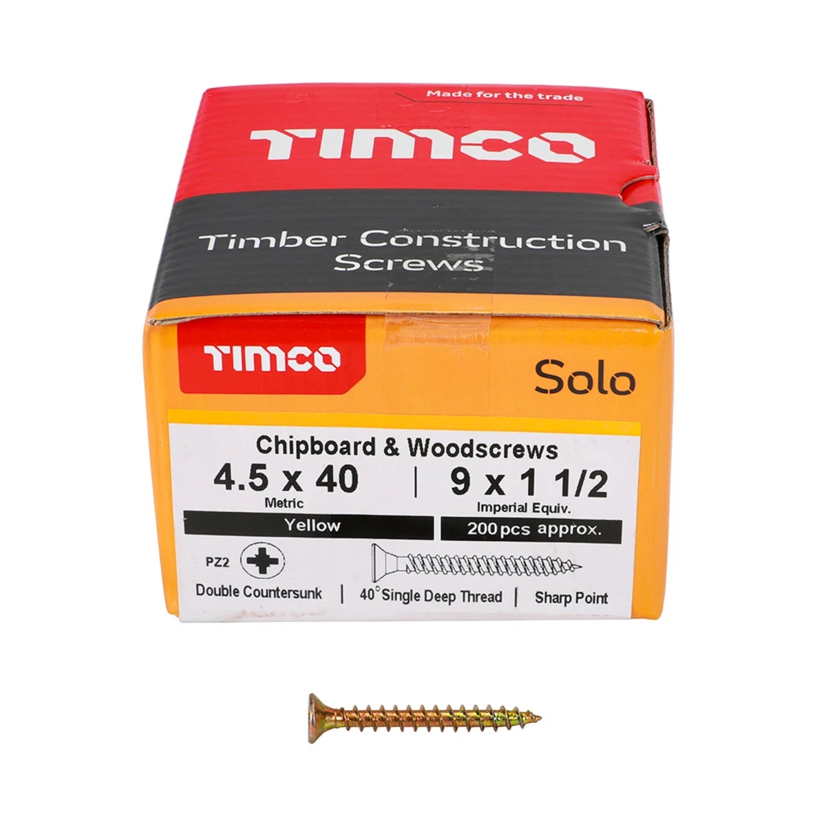The Timco Solo Wood Screws Zinc Yellow 4.5 millimetres x 40 millimetres Pack of 200 delivers professional-grade fastening strength for timber, man-made boards, plasterboard, and sheet materials. Engineered with a deep single thread, sharp point, and double countersunk head, these screws are built to perform across various construction and woodworking applications. Whether used in framing, cabinetry, furniture assembly, or wall fixings, they provide strong grip, fast penetration, and a clean finish. These screws are manufactured from high quality carbon steel and coated with a zinc yellow passivation finish to provide resistance against corrosion in clean and dry environments. With a 4.5 millimetres diameter and 40 millimetres length, they are fully threaded to maximise grip and holding power. Each screw conforms to BS EN 14592-2008 and carries the CE Mark for structural applications, confirming its strength and safety in load-bearing use. The fully threaded design means the screw engages with the material along its entire length, making it ideal for tasks that require a secure, vibration-resistant hold. These screws are especially effective in timber and man-made boards but also suitable for use in masonry when used with a plastic plug, offering flexibility across multiple substrates. A key feature is the 25 degree sharp point which enables quick and accurate starting. This eliminates the need for pilot holes in most woods, reduces the risk of splitting, and ensures a cleaner finish. The single lead design allows the screw to drive straight and with less effort, improving installation speed and consistency. The 40 degree deep single thread delivers excellent pull-out resistance and grip strength. This ensures the screw remains firmly seated under load or pressure, making it reliable for both interior fitting and structural framing. It performs well in softer woods, chipboard, and MDF, reducing the likelihood of the screw working loose over time. Another advantage is the double countersunk head, which not only enhances the strength of the screw under torque but also helps it sit flush with the surface for a tidy finish. This design spreads load across a larger area to reduce the chance of head shear and allows the screw to sit neatly in the material without bulging or protruding. The screws are wax lubricated, which aids in quicker insertion and reduces driving torque. This ensures a smoother installation with less stress on power tools and reduced wear on driver bits. The lubrication also helps to protect against rust during storage and application, increasing the overall reliability of the fixing. These screws are compatible with a No 2 Pozi driver bit, which is widely used and fits most standard power drivers and manual screwdrivers. The cross recess on the head ensures stable and slip-free driving even under high torque, improving control and reducing the risk of cam-out. Each box contains 200 screws, conveniently packed for ease of access and identification on site or in the workshop. The compact box design ensures safe storage and easy transport between tasks. Whether you are working on internal joinery, building frameworks, fixing plasterboard, or working with sheet materials, these screws offer excellent performance and value for a wide range of applications. The Timco Solo XR range is trusted by professionals and DIY users alike for its combination of strength, speed, and reliability. These screws are CE marked and tested to ensure compliance with structural and safety standards, making them a dependable choice for construction and woodworking projects.