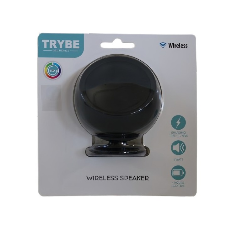 Brand-Trybe Electronics. Colour-Black. Model Number-109500450. Wireless Bluetooth speaker for easy connectivity. Built-in LED lights enhance visual appeal. Powerful 5-watt audio delivers clear sound. Quick charging takes only one hour. Up to four hours of playtime. Portable size ideal for on-the-go. Simple controls for easy operation. Compatible with most Bluetooth devices. Durable build withstands daily use. Perfect for indoor and outdoor use. LED lights sync with music beats. Connects instantly to smartphones and tablets.Customers Viewing This Page May Be Interested in These Sponsored Links