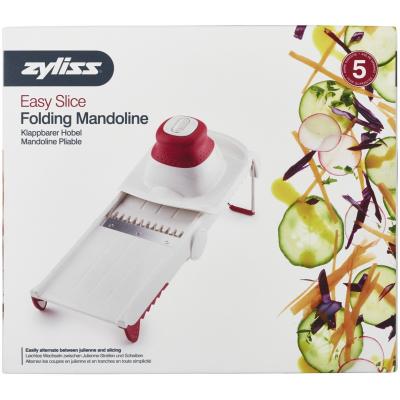 The Zyliss Folding Mandoline is designed for quick and easy slicing of fruits and vegetables. The kitchen mandoline adjusts to offer five slicing thicknesses plus a julienne cut. Its an easy to use kitchen gadget with no confusing blade inserts to remove or replace and saves you time when preparing food. You can get professional, consistent slices in half the time and with minimal effort making this one of the best mandolines on the market. Zyliss produces all of its products to an extremely high and diligent standard. All of our products come with the Zyliss seal of approval allowing you to feel confident in the fact that your chosen product comes made to international standards, well presented in our branded packaging and extremely well packed.
